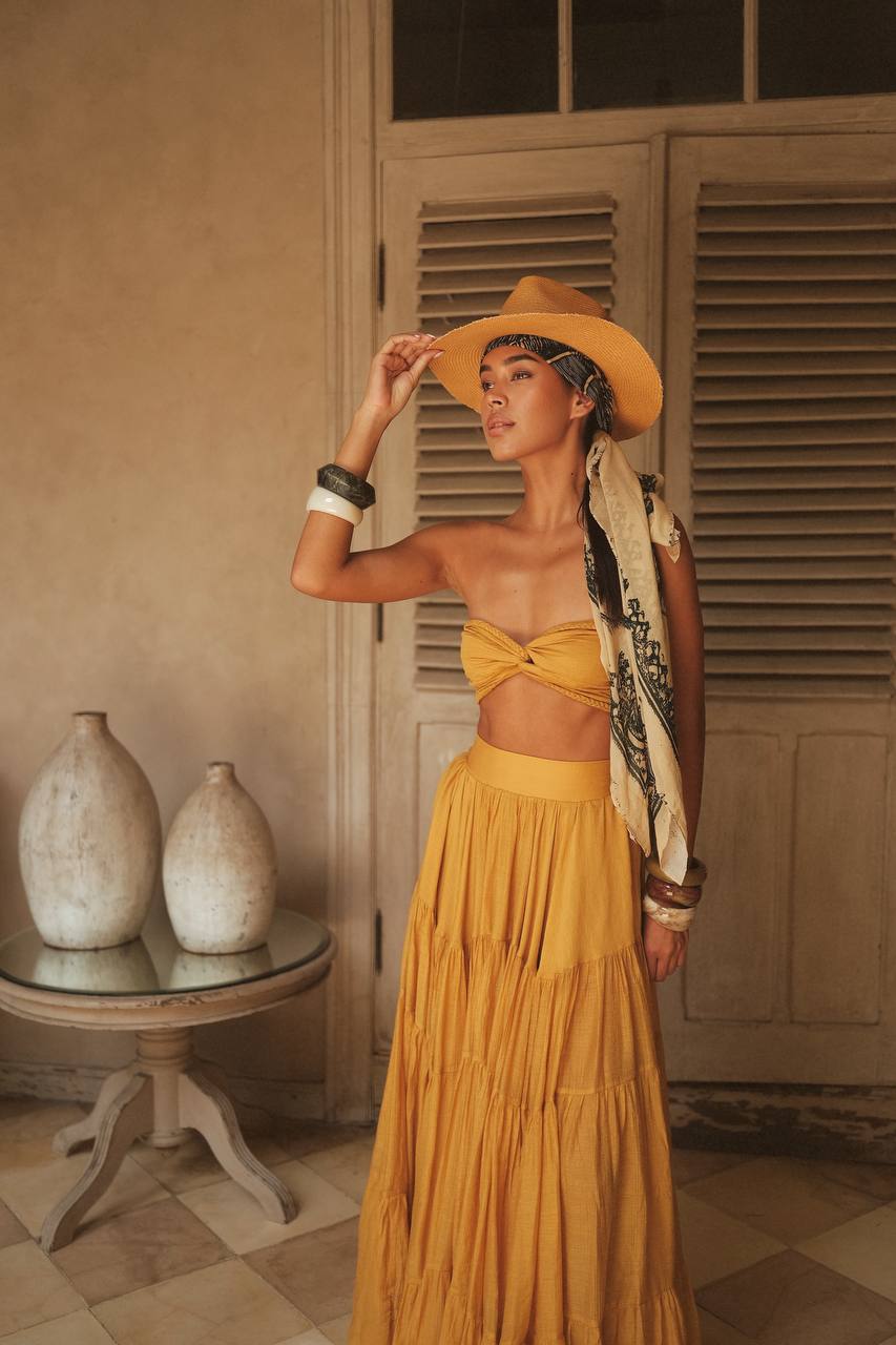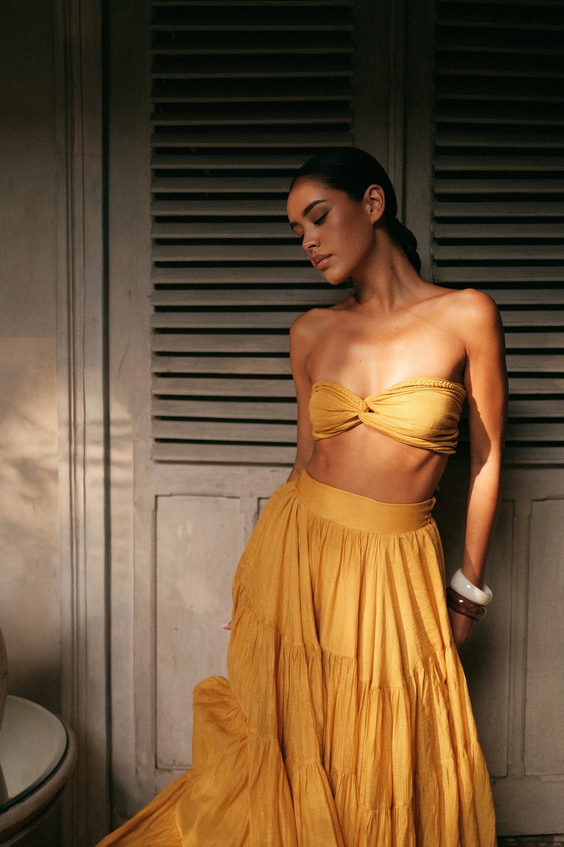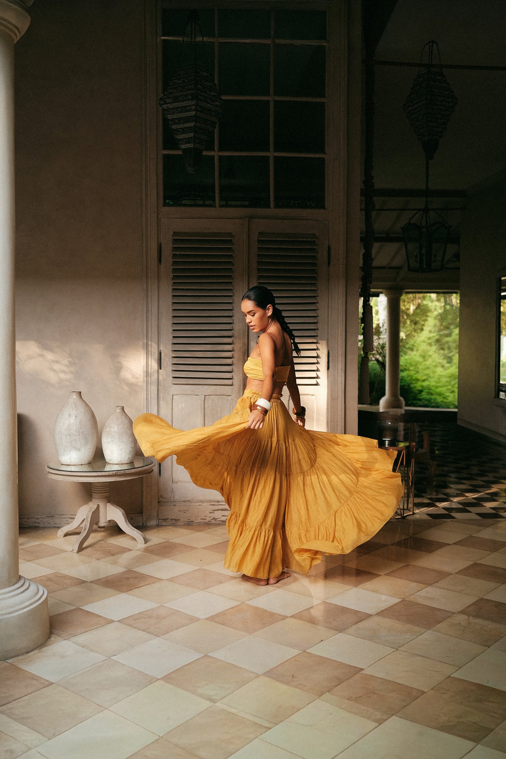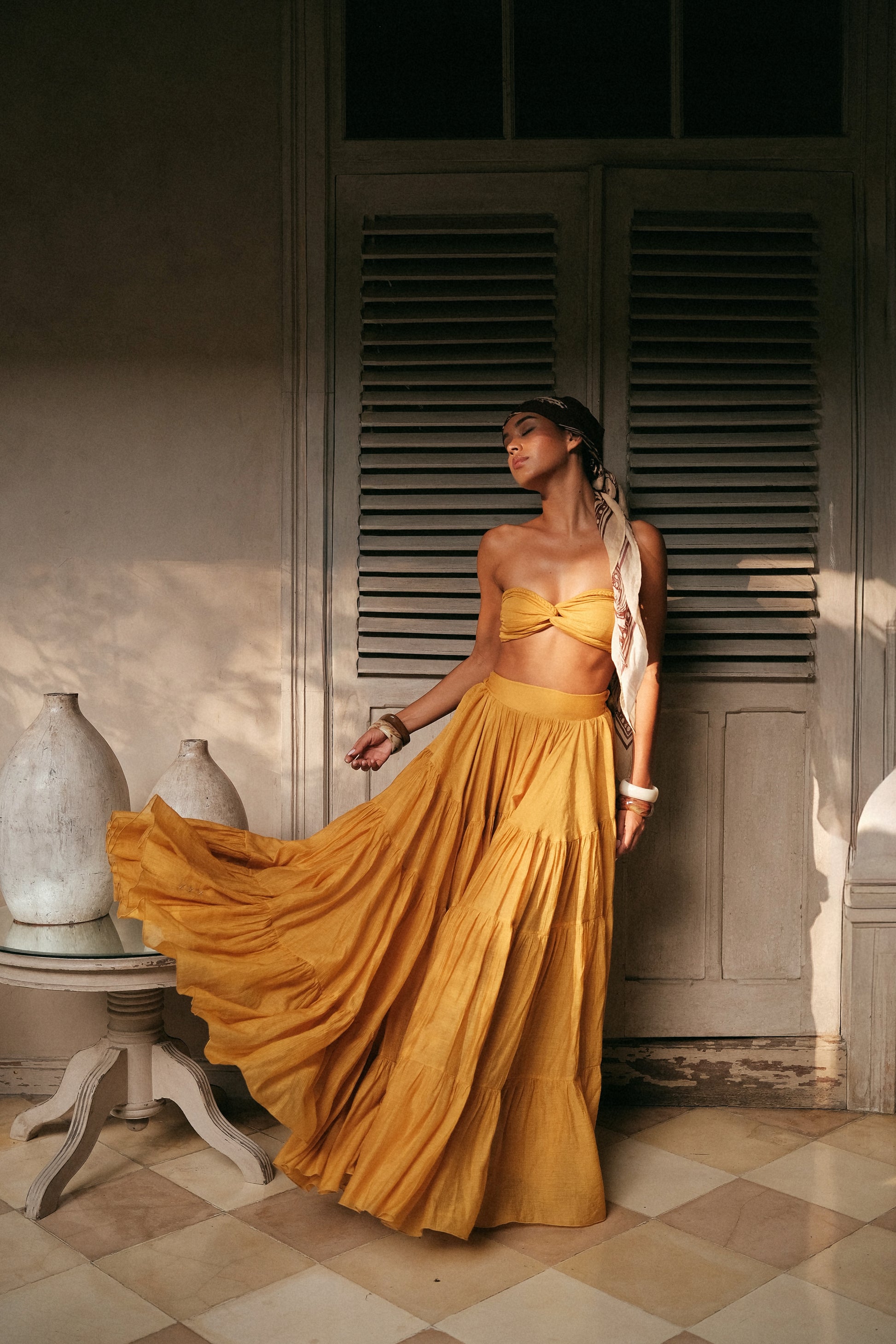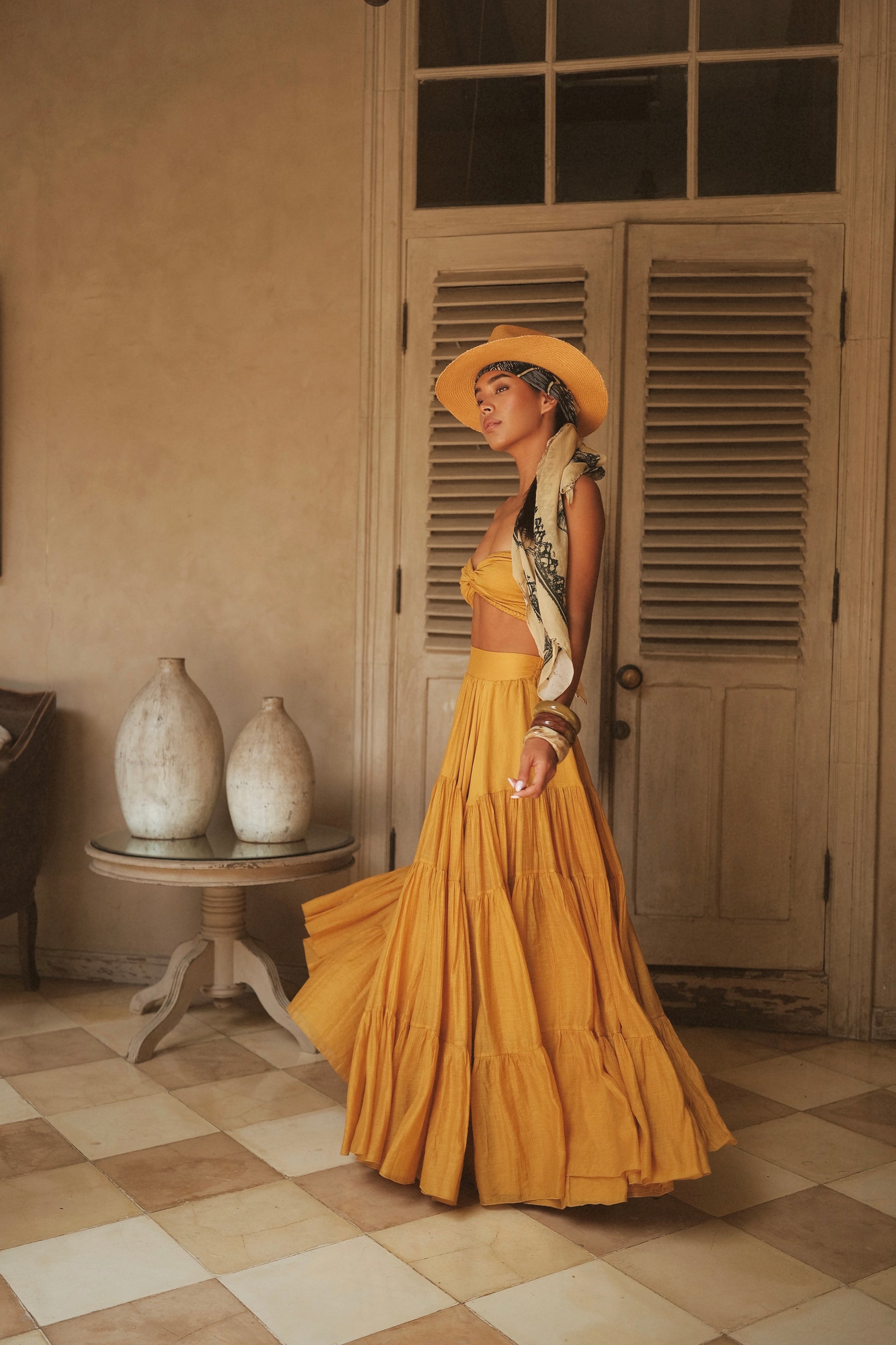The set features a long, voluminous skirt with multiple cascading ruffles, paired with a stylish top adorned with hand-braided details. The top has a soft elastic back, ensuring a comfortable fit that supports the bust without pressure.