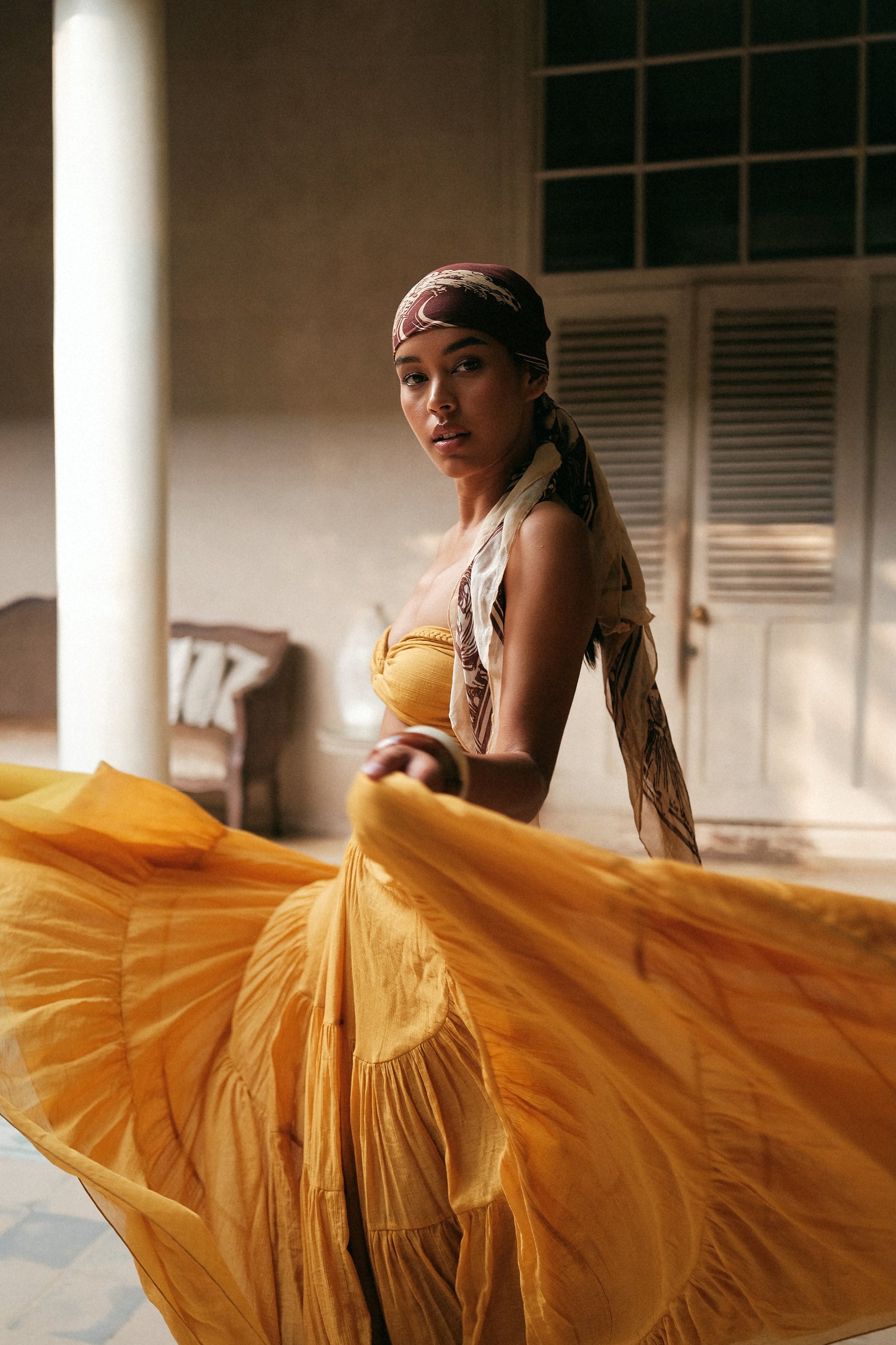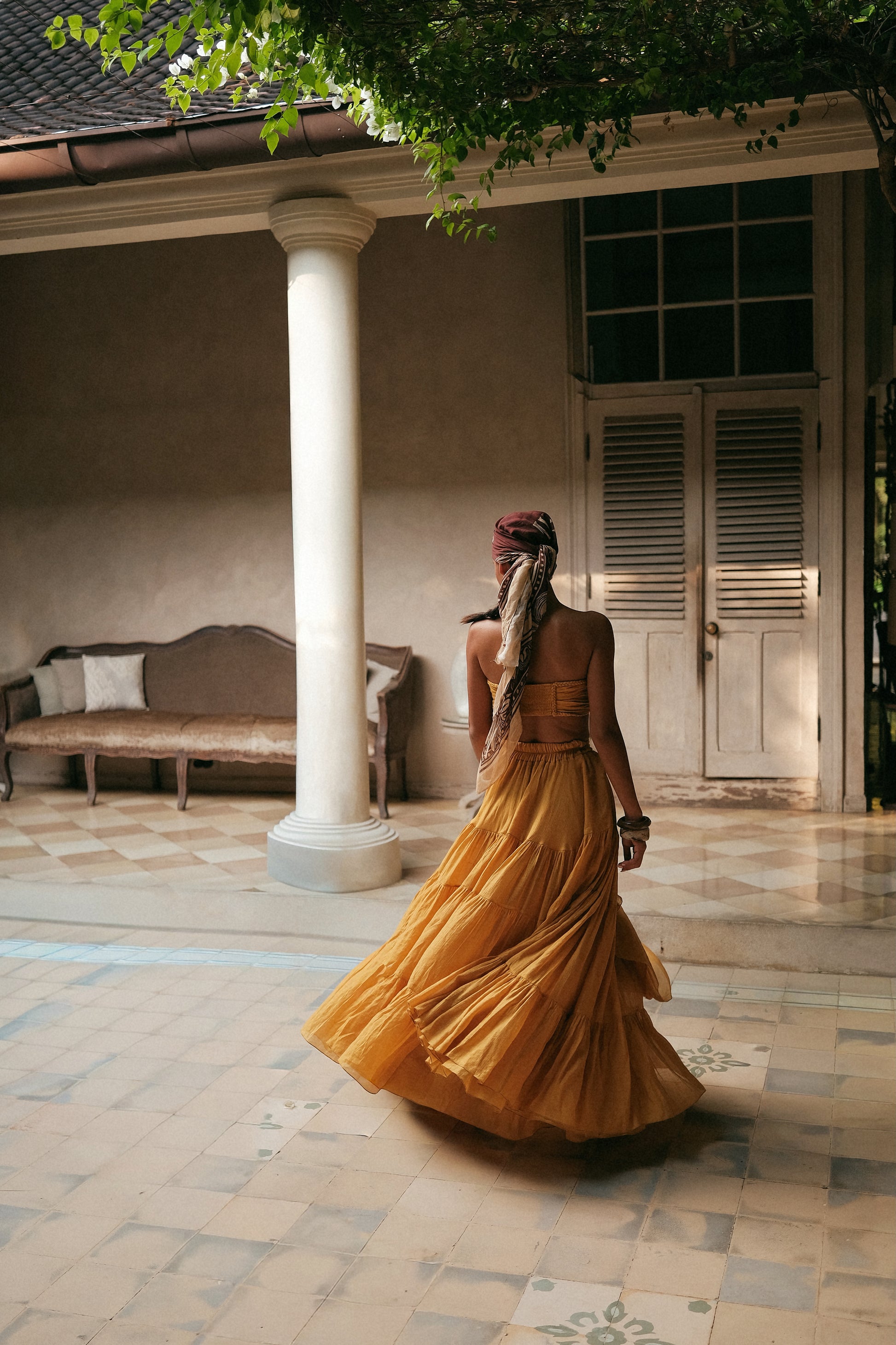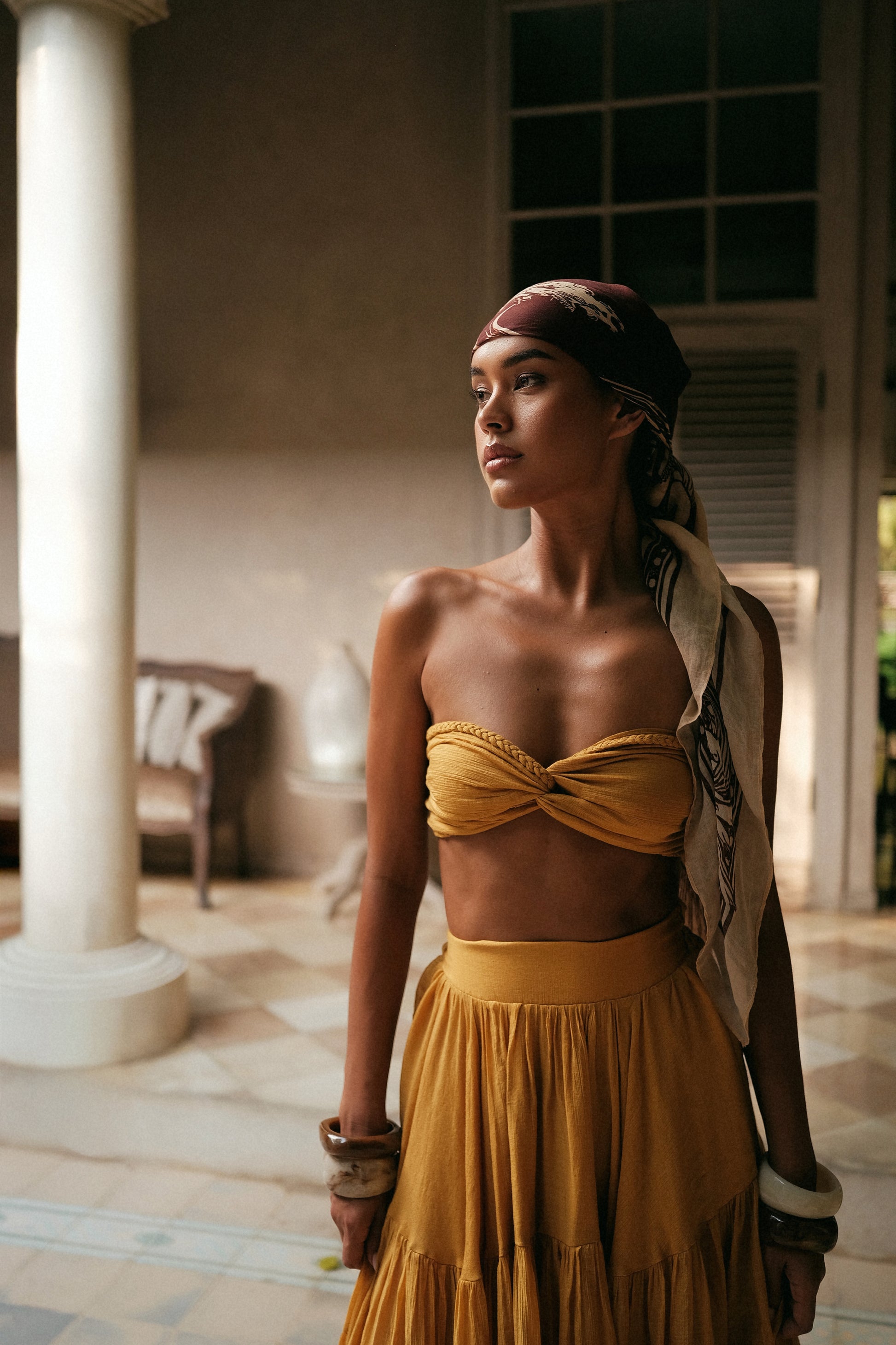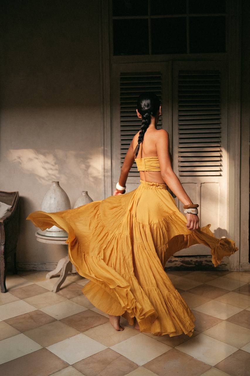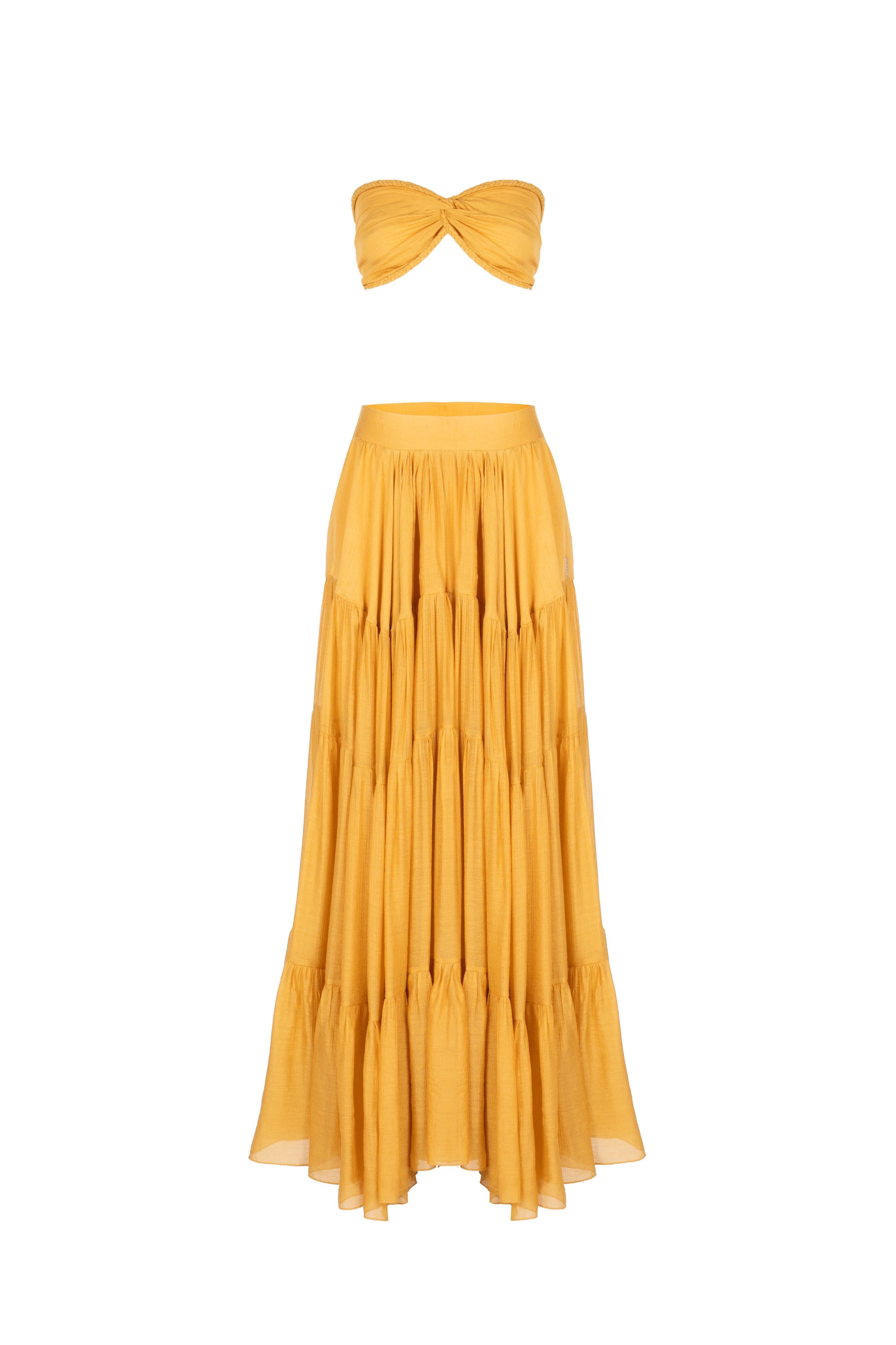The set features a long, voluminous skirt with multiple cascading ruffles, paired with a stylish top adorned with hand-braided details. The top has a soft elastic back, ensuring a comfortable fit that supports the bust without pressure.